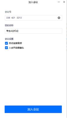 登录后进入等待室,主机位命名“考生编号+姓名+主机位”,辅助机位命名为“考生编号+姓名+辅机位”,加入会议后电脑端连接语音和视频,如果语音和视频不正常在屏幕左下角连接和启用视频,辅助机位关闭音频并保持摄像头开启状态。
