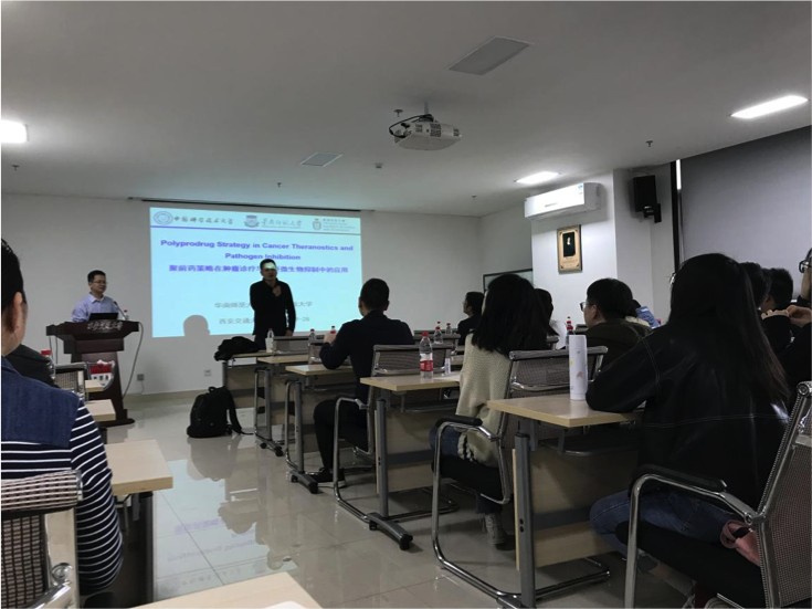 胡祥龙博士应邀为广大师生做了题为《聚前药策略在肿瘤诊疗与病原微生物抑制中的应用》的报告。胡博士讲述了两亲性聚合物前药的概念,详细阐述了其生物效应;并结合自己的研究进展阐述了其在生物医药等领域的应用