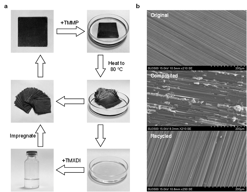 回收利用高价值的碳纤维具有巨大的经济和环境意义。聚硫氨酯共价适应网络的高机械性能,粘接性能与可再加工性可以使碳纤维增强复合材料完全回收再利用。将复合材料浸入硫醇中,交联网络完全降解后可获得回收的碳纤维布和低聚物液体。回收的碳纤维布可以与低聚液再次制备得到性能相当的复合材料,层间剪切强度可保持96%,实现碳纤维增强复合材料的闭环循环。通过扫描电子显微镜(SEM)观察到回收的碳纤维布表面无残留聚合物或可见的损坏。