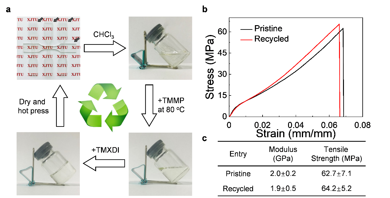 聚硫氨酯共价适应网络可以通过加入过量的硫醇实现从交联体到低聚物的化学回收。且在添加等当量的异氰酸酯后可再次形成交联凝胶。通过干燥,研磨,热压即可重新获得再生的聚硫氨酯共价适应网络,其机械性能可与初代材料媲美。