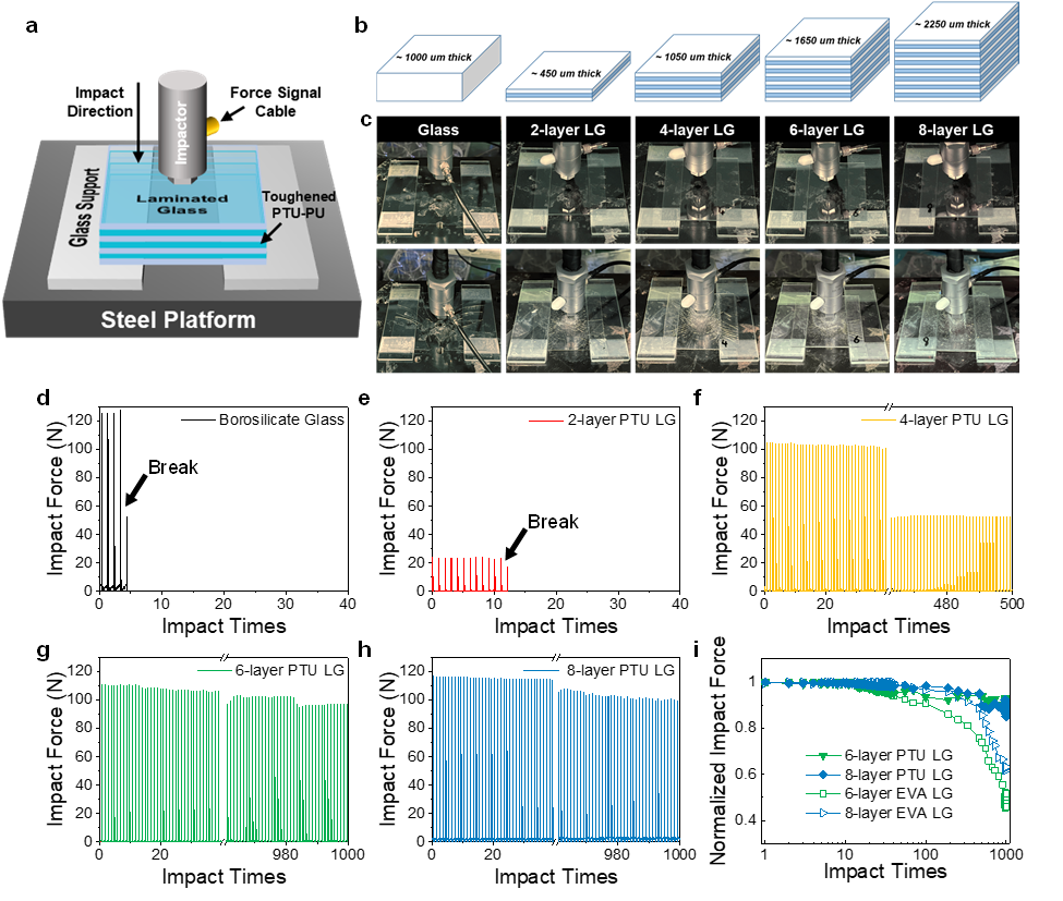 此外,研究人员加入软链段PTMG-1000实现聚硫氨酯共价适应网络的增韧,并将增韧后的材料与玻璃层压复合制备成抗冲击疲劳的层压玻璃。冲击振动器的冲击测试中发现,利用此种材料制备的层压玻璃在受到1000次冲击后仍可承受几乎相同大小的冲击力,而利用商用层压粘合剂乙烯-醋酸乙烯共聚物(EVA)制备成的层压玻璃耐冲击性能则显着降低。证明增韧后的材料可以有效地粘结玻璃并提高其耐冲击疲劳性。