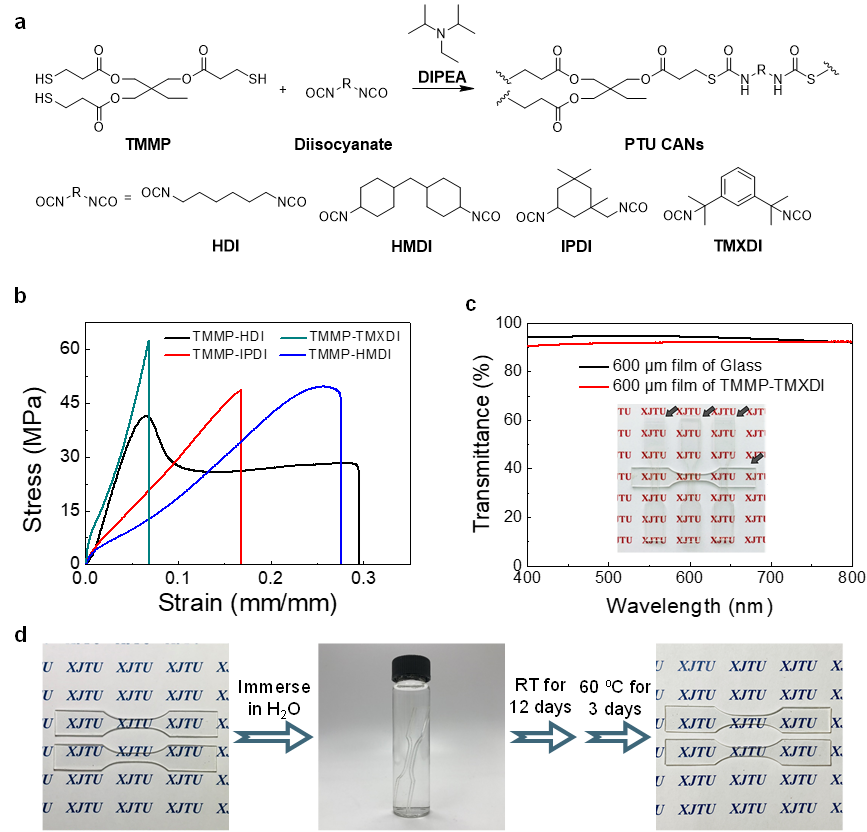 张彦峰研究员团队将商用的三元硫醇(TMMP)与二元异氰酸酯(TMXDI)通过点击化学制备得到具有高机械性能的聚硫氨酯交联网络(杨氏模量为2.0 GPa,拉伸强度为63 MPa),其透明度与同厚度玻璃相近(透光率为90%),且TMXDI中异氰酸酯基团较大的空间位阻,赋予了聚硫氨酯材料优异的耐水解性能。