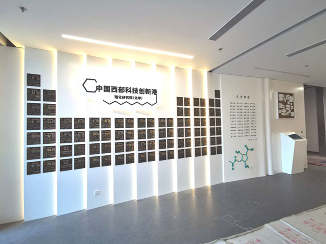 在文化元素的具象化方面,学院着力突出化学学科的特有化学元素和特征,并在此基础上凝练出文化意象,同时融合平面设计、交互式新媒体等表达手段,坚持艺术性与实用性的有机统一,从而实现综合式教学科研空间全方位、立体化和实时性呈现。其中,在化学研究院一层正东走廊,设计“学科分析测试平台”走廊区域,悬挂介绍展板并设置液晶显示屏,介绍各台(套)仪器的功能、使用规范,显示设备3D影像、设备预约情况。在二层正东走廊两侧悬挂研究概况展板,介绍各科研平台及研究所的研究方向、研究成果和相关成员信息。在二到五层正东走廊中部放置交互式电子屏,滚动播出各研究所相关方向科研进展和成果等科研动态。在四层还设计建设了校企合作展示区,基于学院办学理念、育人模式、产教融合、成果转化、p站视频等方面对校企合作进行综合展示。同时,在五层也建设了多功能教工之家,布置风格温馨的教工风采展示区作为党务、会议、培训等工作的开展场所。在各楼层的公共区域放置了沙发、跑步机、乒乓球台等休闲、锻炼设施,供师生工作间隙放松身心,营造轻松愉快、团结合作的工作氛围。