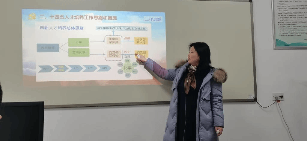 李银环围绕国民经济十四五规划和2035远景目标为支部全体党员讲党课,特别解读了习近平总书记的讲话金句,分享大家认真学习领会、坚决贯彻落实习近平总书记重要讲话精神。结合学院“十四五”规划和人才培养的崭新模式,要求大家保持不畏艰险、锐意进取的奋斗韧劲,坚定信心决心,强化实践教学环节,以“厚基础、强交叉、重实践”为教育理念,坚持“三全育人”,培养不仅具备扎实的化学专业知识、精湛的实验技能和开阔的国际视野,更兼具科学精神和人文素养、有担当、能干事的综合型创新人才。