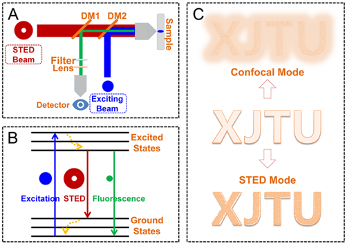 荧光成像技术因其响应速度快、灵敏度高等特点而备受关注。然而,由于阿贝衍射极限的存在,传统的荧光显微成像技术在分辨率上有一定的限制,这在一定程度上影响了其在精准成像领域中的深入应用研究。受激辐射损耗技术 (Stimulated Emission Depletion Microscopy, STED)、随机光学重建显微技术 (Stochastic Optical Reconstruction Microscopy, STORM) 等超高分辨成像技术的提出,为解决上述问题提供了思路和方法。其中,STED超高分辨成像技术已经在生物医学和材料科学领域中显示出了巨大的应用前景。