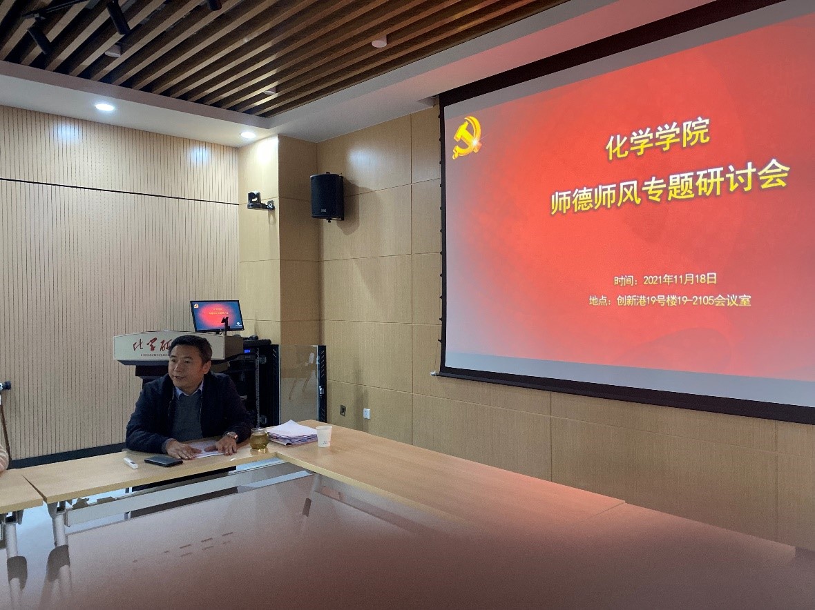 在创新港泓润楼19-2105会议室召开师德师风建设研讨会。党委委员、支部书记、中层干部、学生支部书记和部分学生党员代表参加了会议。