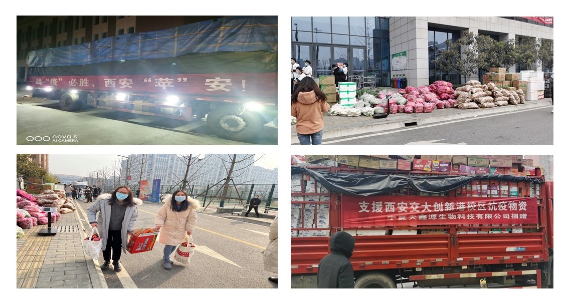 西安不是孤岛,爱心没有隔离。这是一方有难、八方支援的动人图景,是同舟共济、众志成城的生动实践,凝聚起了战胜疫情的强大合力。12月31日,中核陕西铀浓缩有限公司租用专车送来了水果、蔬菜和副食品;1月1日北京伊诺凯科技有限公司捐赠的免洗手消毒液、连体防护服,山西佳维新材料股份有限公司捐赠的袋方便面、香肠、小面包等。1月2日风润智能装备股份有限公司蔬菜、水果,陕西中华蓝天化工新材料有限公司捐赠的苏打饼干、老干妈等。1月5日,宁夏天鑫源生物科技有限公司的捐赠的清真食品,风润智能装备股份有限公司、西安市衡阳商会、卡尔蔡司(上海)管理有限公司等一批批物资纷纷到来……防疫物资由学校疫情防控指挥部统一分配,新鲜蔬菜由后勤保障部协调发放,水果及副食品被第一时间发放给学院学生手中。