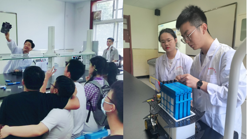 郗凯教授以国家能源需求为切入点,向大家介绍“可充放的世界”中电池在汽车、手机等生活中的应用,讲述锂离子电池、纽扣电池、柱状电池、块状电池的原理及其目前电池的安全性分析,通过无人机演示,讲解无人机对新一代电池的技术需求,现场用无人机为同学们拍照合影留念;肖春辉副教授向学生介绍电池的发展历程,讲述“金属+空气=电池”的原理和优势,以及在助听器、电子手表、计算器、航海照明、电动汽车中的应用场景,并以实验室自制设备进行演示。