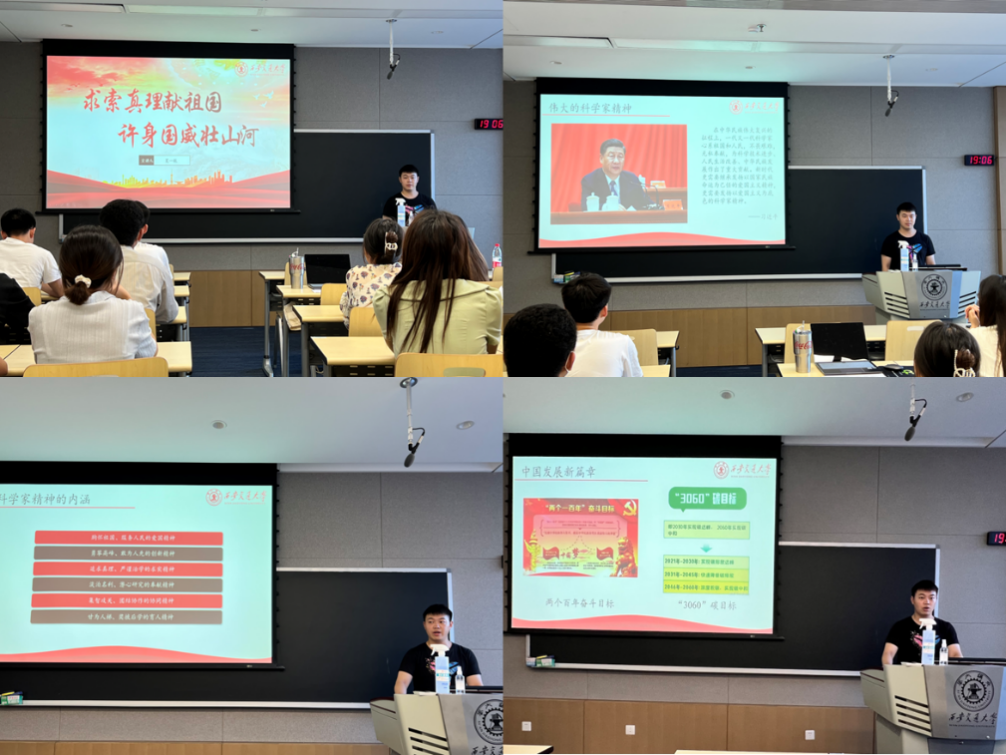 学生微宣讲团(筑梦社)宣传部副部长,化工学院夏一航同学进行“求索真理献祖国,许身国威壮山河”主题宣讲,夏一航首先带领支部成员回忆了“两弹元勋”邓稼先筚路蓝缕,艰苦奋斗,在戈壁滩放“大炮仗”的动人事迹,接着通过介绍钱学森、袁隆平和陶文铨等为国家、为人民做出重大贡献的老一辈科学家们勇攀高峰,开拓创新、威武不屈,心系祖国、艰苦奋斗、不怕吃苦的精神,让支部成员深刻体会到伟大的科学家精神。通过夏一航精彩生动的讲述,支部成员们真正体会到了科学家精神的内涵,以及身为交大学子所肩负的使命与担当。