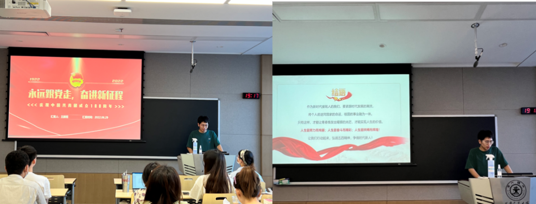 牛沭文同学讲到,青年的我们是新时代的接班人,承载着国家和民族的光明未来。今年建团100周年,我们要不忘初心,继续前进,努力拼搏,要继续保持不屈的意志,坚定自己的理念,饱满激情,迎接一轮又一轮的新挑战和创新,面对困难时,更要迎难而上,克服困难,继续扬帆起航,开阔新天地。身为新时代的青年,我们要有使命感,肩负起时代赋予的使命,争做时代先锋。“