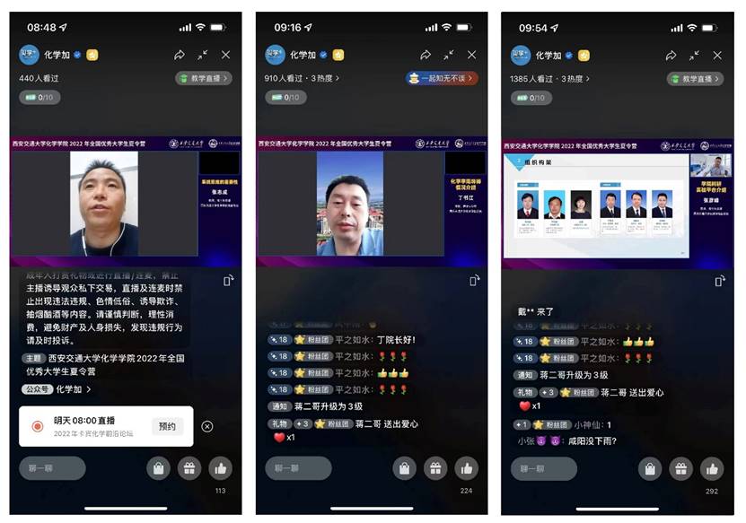2022年全国优秀大学生夏令营在“云”端举行。本届夏令营活动吸引了全国百余所高校的500余名优秀学子报名,最终有150名学生入营参会。夏令营活动于7月22日上午八点半正式开营,通过腾讯会议、B站和化学加多个宣传平台进行了直播宣传,p站视频