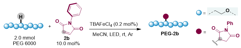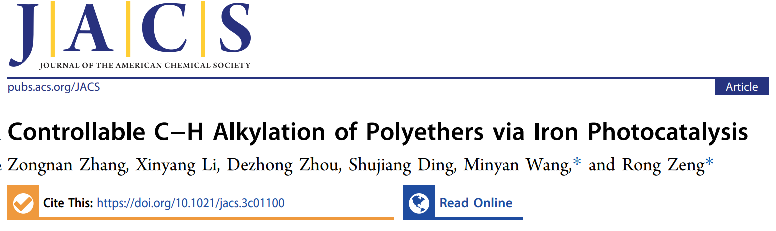 曾荣教授自2018年回国以来,也一直致力于廉价铁金属催化体系的开发以及在惰性键活化中的应用。近日,该团队结合光促铁催化策略,报道了首例可控聚醚C–H键烷基化反应,高效的实现了聚醚类化合物的主链C–H键官能团化。反应无明显降解产物,表明活性更高的C−O键断裂得到了显著抑制。该反应具有条件温和、催化活性高、催化剂廉价易得、优秀的聚醚普适性、良好的功能团容忍性等优点。