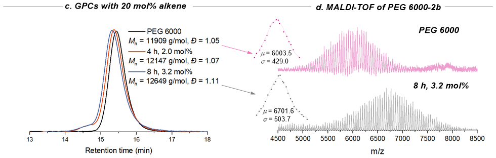 聚乙二醇(PEG)由于其良好的水溶性、无毒性以及与碱金属易配位性等特点,被广泛运用于界面修饰、生物官能团化、药物传载、水凝胶合成以及固态电解质等领域。聚乙二醇的官能团转化在其中扮演着举足轻重的角色。然而,受限于其特殊的分子结构,聚乙二醇官能团转化往往只能发生于末端羟基,而主链中广泛存在的C–H键由于较高的键能以及较低的极性,其官能团化极具挑战也鲜有报道。其中,关键的科学问题和反应转化难点就是如何发展高活性催化体系实现相对惰性的C–H键高效转化并且抑制活性更高的C−O键断裂。