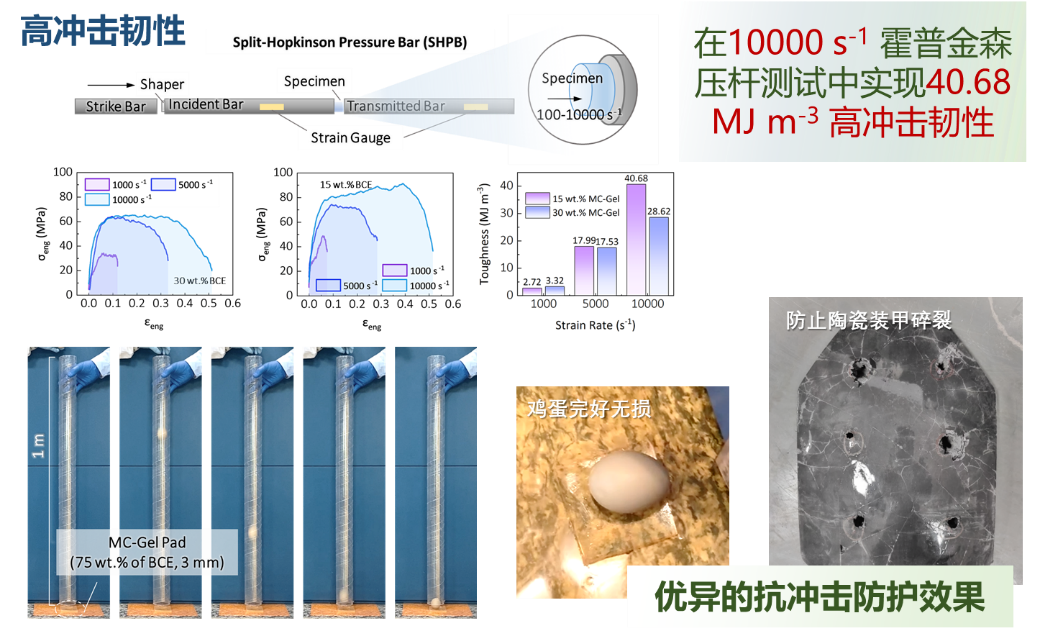 同时,“分子阻塞”效应作为一种非共价耗散机制,赋予了凝胶材料独特的粘弹性力学特性,使其具有高阻尼,在全模量调控范围内的阻尼系数大于0.3,最大阻尼系数达 1.8;在10000 s-1 的分离式Hopkinson压杆测试中,最大冲击韧性达到40.68 MJ m-3,达到和超过了商业化的聚氨酯和聚脲材料。具有超低模量和超高阻尼的“分子阻塞”凝胶可有效保护鸡蛋从 1 米高处掉落而不发生破裂,高强度“分子阻塞”凝胶可保护陶瓷装甲经受步枪射击6次而不发生碎裂,充分验证了这一类材料在冲击防护领域的应用潜力。