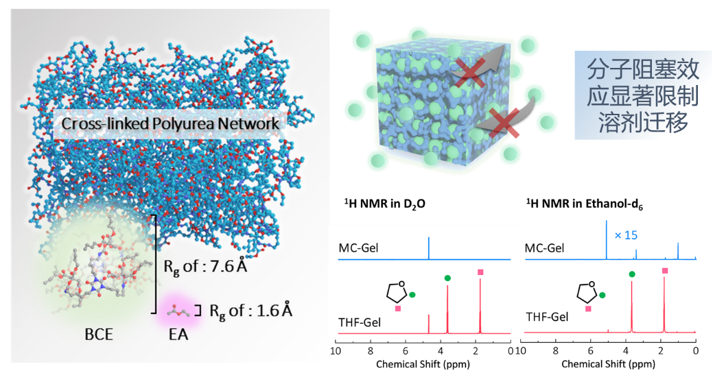 通过设计和合成分子尺寸超过 1.4 nm 的液态支链柠檬酸酯 (branched citrate ester, BCE),并将这种大体积分子作为溶剂与交联聚脲原位聚合,制备获得系列新型“分子阻塞”凝胶。由于大体积 BCE 溶剂和交联网络的网孔尺寸相当,溶剂难以穿过交联聚合物移动,有效抑制了溶剂的长程迁移。“分子阻塞”凝胶具有与普通聚合物或弹性体相媲美的卓越稳定性,可储存 10 个月而无任何形貌或力学性能改变,并能耐受高温烘烤,保持质量和性能的稳定。
