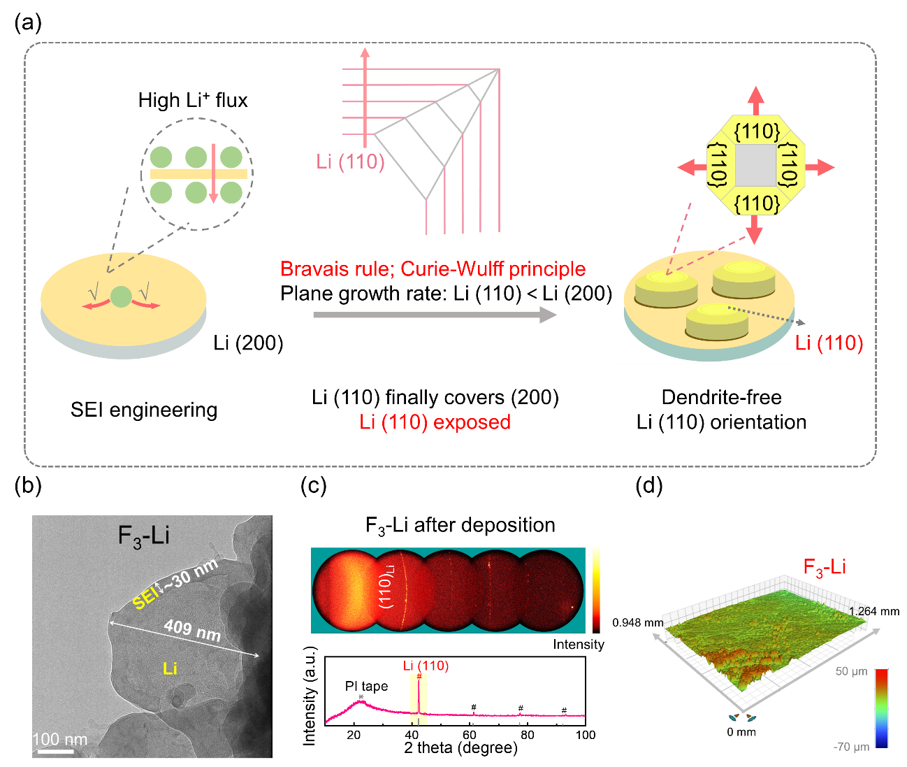 丁书江教授、肖春辉教授课题组通过设计高通量固态电解质界面(SEI),诱导Li(110)取向的锂沉积,实现了无枝晶锂金属电池。如图1所示,通过简单高效的SEI工程,采用CF3Si(CH3)3(F3)滴涂策略,有效诱导高LiF和-Si(CH3)3含量的高通量SEI(F3-SEI)。加速了Li+的传输动力学,确保SEI下的高的Li+浓度,有利于的Li(110)取向。通过Bravais规则和Curie-Wulff原理,解耦了SEI工程与锂电结晶择优取向之间的关系。多光谱技术与动力学分析表明,诱导的Li(110)晶面进一步促进了Li原子的表面迁移,避免尖端聚集,从而形成了平面的、无枝晶的Li沉积。F3-SEI使Li||Li对称电池能够长期稳定336天以上。F3-SEI也能显著提高Li||LiFePO4和Li|||NCM811扣式电池和软包电池的循环寿命。该工作对从晶体学角度抑制Li枝晶提供新的思路,促进性能优异的LMBs的发展,也为其他金属晶体的择优取向提供一定的指导。