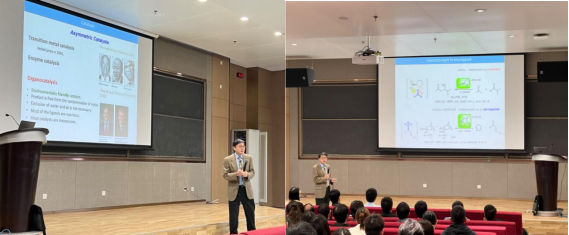 有机小分子催化,在2021年获得诺贝尔化学奖。有机小分子为催化剂从简单非手性的原料合成手性化合物单一对映体的技术,是不对称合成领域中最为活跃的研究方向之一。Hayashi教授系统地阐述了当时发明催化剂的历程,成功将其运用于醛与硝基烯烃的不对称麦克尔加成反应中,高效地合成了单一的手性分子。同时,Hayashi教授分享了基于“Pot Economy”策略的多种分子的全合成。合成方法十分高效简洁,且不需要多次分离纯化,具有巨大的经济效益。总之,本次报告内容充实新颖,为我校化学相关研究领域提供了十分超前的研究思路。