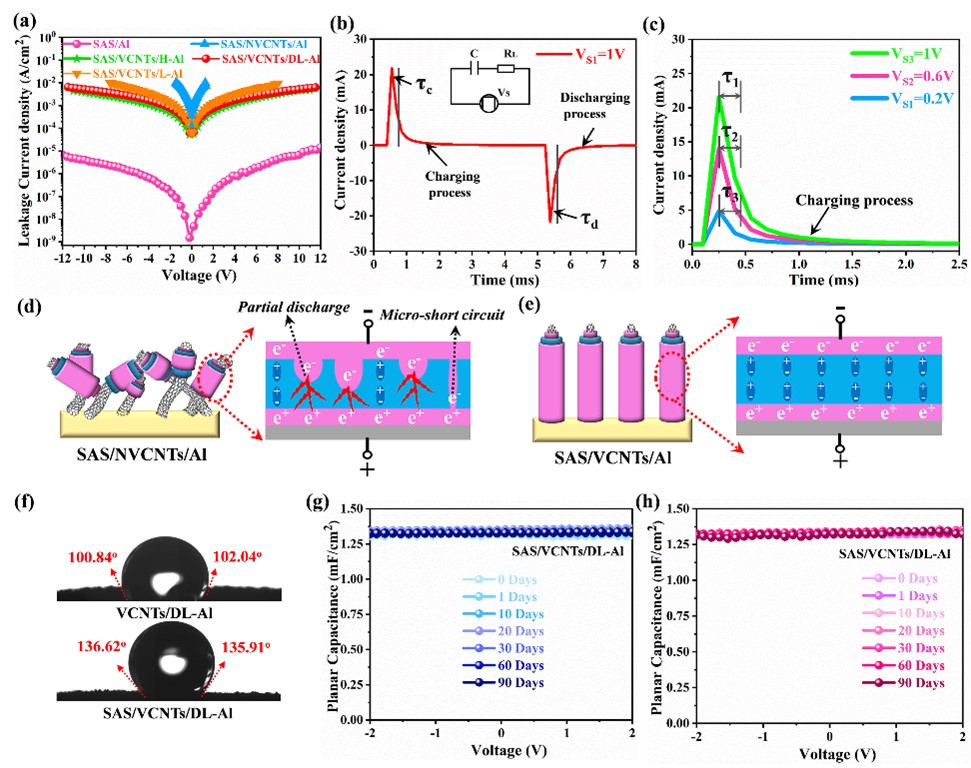 图2. (a)电容器的漏电流密度与电压关系图;(b)电容器的充放电曲线;(c)电容器不同电压电源下的充电过程;(d,e)电容器的充电原理图;(f) 功能材料与水的润湿性;(g,h)为电容器在大气和水环境中的C-V特性稳定性。