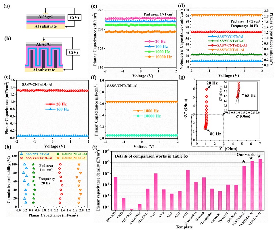 图1. (a,b) 电容器测试结构示意图;(c-f) 电容器C-V特性;(g)电容器阻抗谱;(h)平面电容密度分布。(i) 不同纳米结构模板电容器的等效平面电容密度比较图。