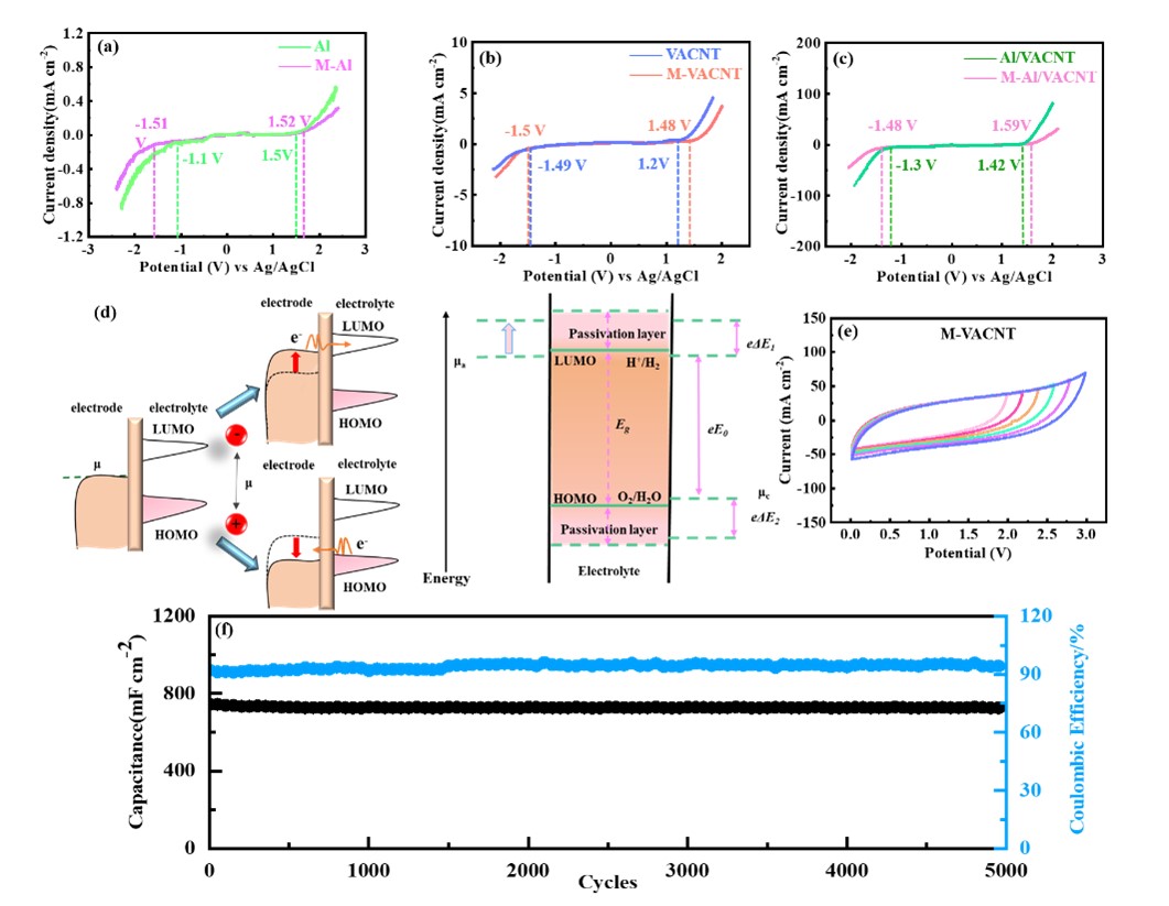 杜显锋教授团队提出了一种新的电极表面处理策略,即在铝基碳电极中引入钝化层,从而扩宽水系超级电容器的电压窗口。该钝化层可以保护集流体表面不被水分子的侵蚀,使得铝集流体表面的 HER过电位相对于增大至- 1.51 V,从而使铝基底表面分解电压变宽。此外,在活性材料中引入缺陷使得碳材料的OER过电位扩宽至1.48V。对于整个电极来说,电化学稳定窗口可被扩大至3.07V。采用广义梯度近似 (GGA)/PBE理论计算模型对电极表面修饰前后的最低未占据分子轨道(LUMO)和最高占据分子轨道(HOMO)进行模拟,结果表明引入钝化层可扩大LUMO和HOMO之间的能隙,使得水系超级电容器的电压窗口增加至3.0V。组装的水系超级电容器循环5000次后库仑效率和电容保持率分别为97%和96%。本工作从电极修饰的角度提高了水系超级电容器的电压窗口,为实现安全可靠的高压水系储能装置提供了有效的指导。