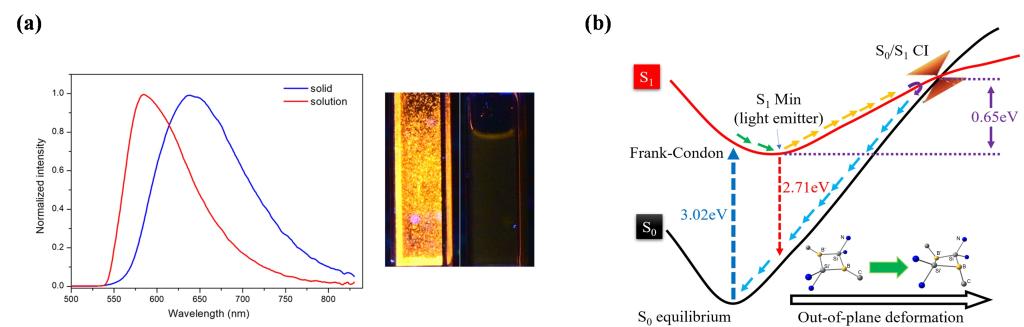(a) 在固体及溶液状态下,化合物2的荧光发射图谱及在365 nm紫外光照射下的图片;(b) 模型分子的荧光发射及非辐射衰减过程机理图