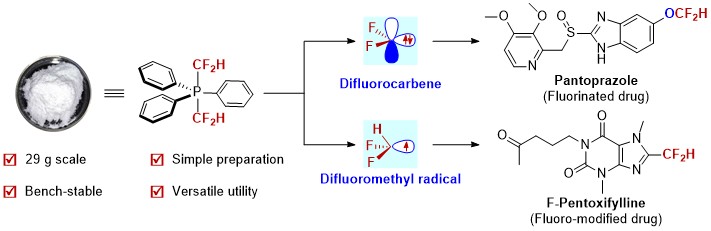 胡明友等人利用叔膦作为原料,开发了一类结构新颖、制备简单、可快速大量合成的双(二氟甲基)五配位膦烷,该类五价磷可通过二氟甲基自由基途径,实现缺电子杂环的氧化二氟甲基化、镍/光协同催化芳基溴代物的二氟甲基化、以及光氧化还原催化烯烃的氢二氟甲基化;或通过二氟卡宾途径实现烯烃的二氟环丙烷化、碱促进杂原子亲核试剂的二氟甲基化、钯催化芳基硼酸的二氟甲基化、以及铜介导芳基碘化物的三氟甲基化。这些氟烷基化方法成功应用于多种药物分子和药物分子类似物的后期氟烷基化反应,并有潜力应用于正电子发射计算机断层扫描(PET)中18F示踪剂的合成,相关研究还在进行中。
