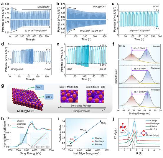 丁书江教授和苏亚琼研究员设计了一种具有双活性位点的新型锰基正极催化(MOC@NCNF),并系统地研究了不同锰活性位点的电子构型和Li-CO2电池电化学性能之间的构效关系。结果表明,MOC@NCNF催化正极和大多锰基催化剂一样,在电池循环初期存在电活化现象。作者通过对不同放/充电状态下电极组成和电子结构的表征,首次揭示了这种活化现象是由于Mn(III)的原位电化学生成和稳定存在造成的。同时作者又对基于MOC@NCNF正极Li-CO2电池的循环过程和产物的演变进行了系统表征,明确了MOC@NCNF正极中Mn(II)和Mn(III)的电化学重构对CORR和COER的催化性能有显著影响。