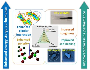 通过引入长链侧基增强加工韧性和极性,同时利用氟效应缓解柔性链段引起的击穿强度下降和能量损失增加,有效解决了玻璃态聚合物优异储能性能与加工性能之间长期存在的矛盾。氟苯乙烯与氟化长链甲基丙烯酸酯共聚,一方面,长链侧基的高极性可提高共聚物的介电常数。另一方面,引入氟原子能够增强偶极相互作用,提升链间距,从而抑制取向弛豫引起的能量损失。此外,引入具有强吸电子性质的氟原子也被证实可以提高电子捕获能力,从而显著降低漏电传导损耗,提高击穿强度。值得注意的是,引入长链侧基能够增强介电薄膜的自修复性能,有助于提高介电寿命。这项工作利用氟效应来协调玻璃态聚合物的高储能和可加工性之间的冲突,并采用长链侧基来增强韧性和自修复性,成功实现低能量损失和高击穿强度,从而避免与低玻璃化转变温度相关的问题,例如高能量损失和低击穿强度,有效解决储能性能与加工性能不可调和的矛盾。