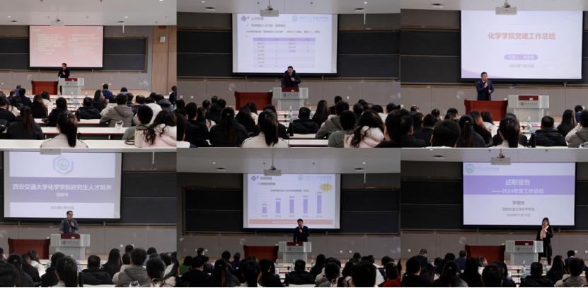 党委副书记、院长丁书江,党委书记张志成,副院长段新华、张彦峰、李银环依次上台进行个人2024年工作现场述职,同时还由主要负责人代表班子进行述职。各位班子成员用PPT展示了过去一年各自分管领域的工作成果和心得体会。他们围绕思想政治学习、学科建设、本科生招生、人才培养、科研进展、国际合作、廉政作风等多个方面,展示了p站视频