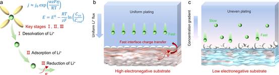 锂金属负极因其超高理论比容量(3860 mAh g⁻¹)和最低电化学电位(-3.04 V vs. SHE),被视为下一代高能量密度储能体系的核心组件。然而,其“无宿主”特性导致在锂沉积过程中易形成枝晶或苔藓状结构,诱发剧烈体积膨胀、界面失稳及电解液持续分解等问题,严重制约其实际应用。尽管现有策略(如人工SEI构建、合金化宿主设计及三维集流体调控)在一定程度上可缓解枝晶生长,但多数方法依赖经验性设计,缺乏从原子尺度协同优化界面电场、离子分布与反应动力学的普适性理论框架。值得注意的是,电负性——这一表征原子吸引电子能力的基本物理量,长期以来尚未被系统用于锂金属电池的界面工程定向设计。理论上,提高表面端基的电负性可增强对Li⁺的吸附并排斥阴离子,从而加速Li⁺脱溶剂化过程,均匀化界面离子通量并引导稳定成核。