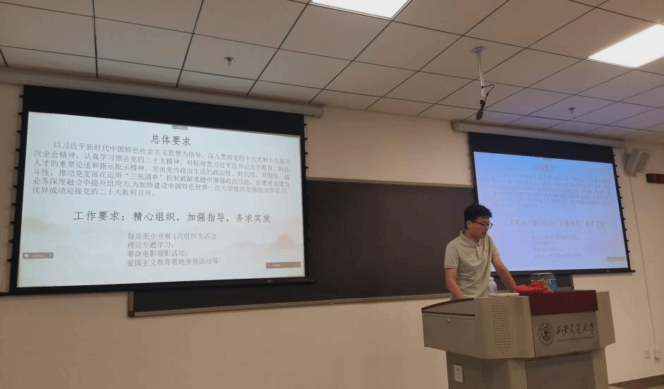 会议伊始,原新生党支部书记王鹏程简要介绍党支部换届情况及新生党支部的干部组成。紧接着党支部书记姜显智以“严守纪律规矩、加强作风建设”为主题,强调纪律教育的政治性、时代性、针对性,学生党员要严格自我要求,以优异成绩迎接党的二十大胜利召开。在会上汇报了新生党员参与党纪法规知识竞赛的完成情况,要求大家摆正态度,认真作答。