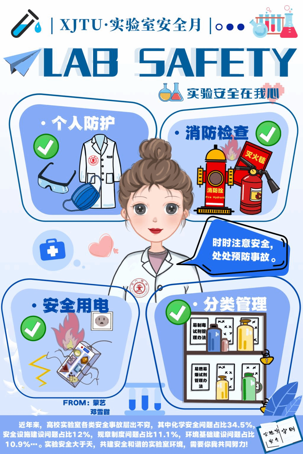 logo的实验服的女生发出实验安全倡导,鼓励大家行动起来共建平安健康校园。
