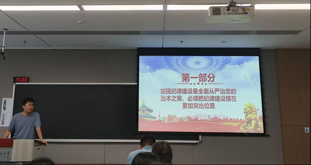 本次会议,以“党的纪律学习”为主题。会议伊始,支部书记成一龙老师强调纪律学习的重要性。成一龙老师结合自身工作实际,谈了对纪律建设的理解和感悟,并指出,面对新形势下的各种挑战,全体党员必须时刻保持警觉,自觉抵制不正之风,维护党的形象。每位党员需在日常工作和学习中完善纪律践行情况,以确保纪律学习的常态化、制度化。