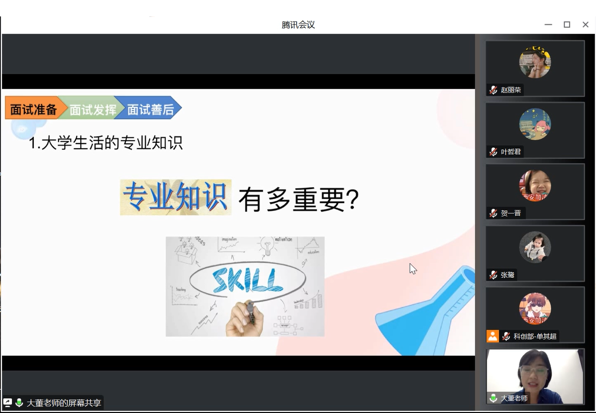 为满足广大研究生的求职需求,提升研究生就业质量,鼓励有理想、有信念、有担当的交大学子建功立业,2023年5月18日19时,p站视频 2024届毕业生面试技巧专题讲座通过线上腾讯会议形式成功举办,吸引了全院不同年级的同学参加。本次讲座邀请到学而思大学生考研教育学专业负责人、教育学主讲老师、就业指导老师——大董老师给本院学生分享求职相关事宜,本次分享会由p站视频 团委科创部部长单其超主持。