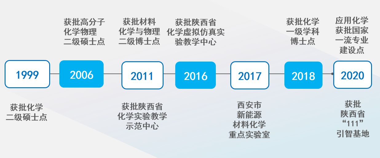 化学学科于2000年设立应用化学二级学科硕士点,2006年设立高分子化学与物理二级学科硕士点,2012年获批化学一级学科硕士点,具有材料化学与物理二级学科博士授予权,2018年获批化学一级学科博士点。2002年获批陕西省先进功能材料及介观物理重点实验室,2011年获批陕西省化学实验教学示范中心,2016年获批陕西省化学虚拟仿真实验中心,2017年获批西安市新能源材料化学重点实验室。